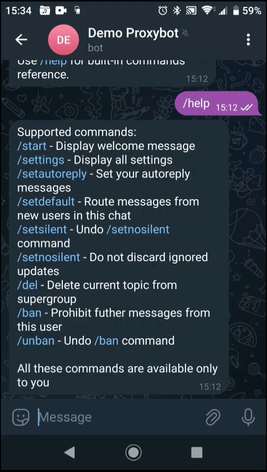 This Proxybot is a Telegram bot designed to forward all incoming messages to its owner. Proxybot enables it's owner to: